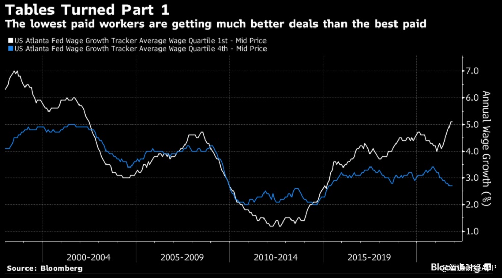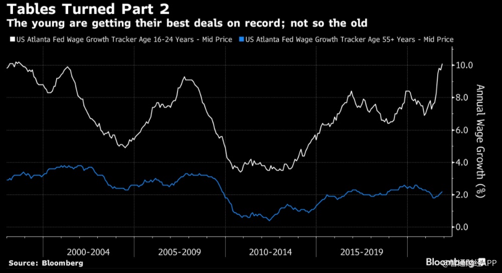 与此同时,该指标表明,美国劳动力市场正在发生历史性的变化,最年轻和工资最低的人终于有能力获得更高的“薪酬”,而工资最高和55岁以上的人的待遇则比以往更糟。