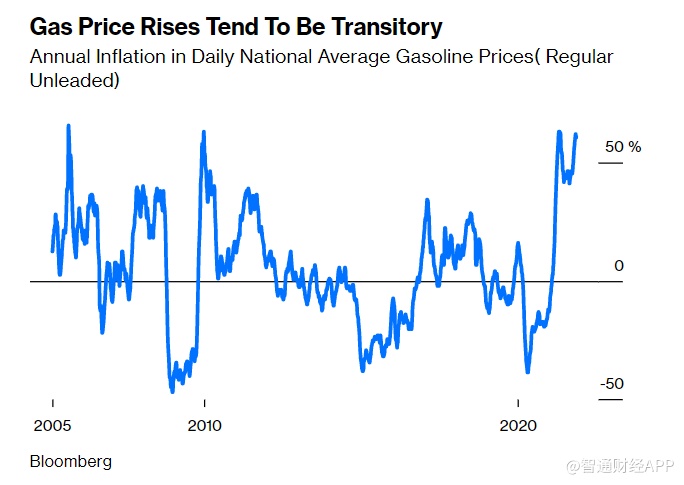 汽油价格不会连续以超过50%的同比增速增长。 如图表所示,不久之后,汽油价格很可能会同比下降,并有助于降低整体通胀。