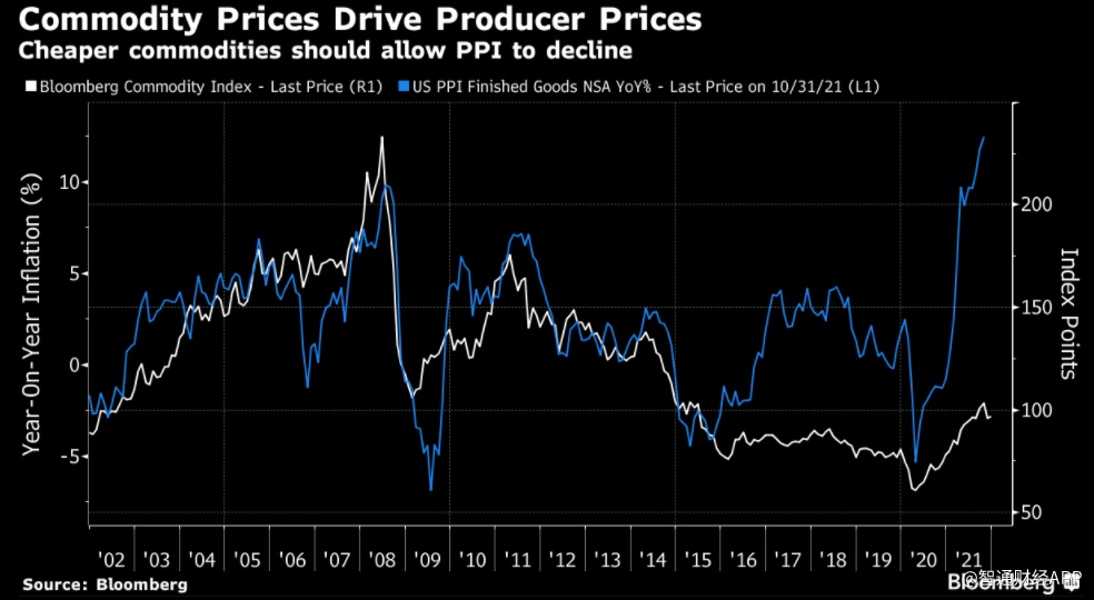 从更广泛的角度来看,大宗商品价格上涨往往会推动生产者价格指数(PPI),原因显而易见。而彭博商品指数(Bloomberg Commodity index)最近一直在下降: