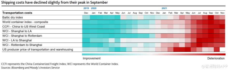 穆迪投资者服务公司整合了一系列运费指标,如下图所示。 大多数航道的运费似乎已经开始从峰值下降了一些: