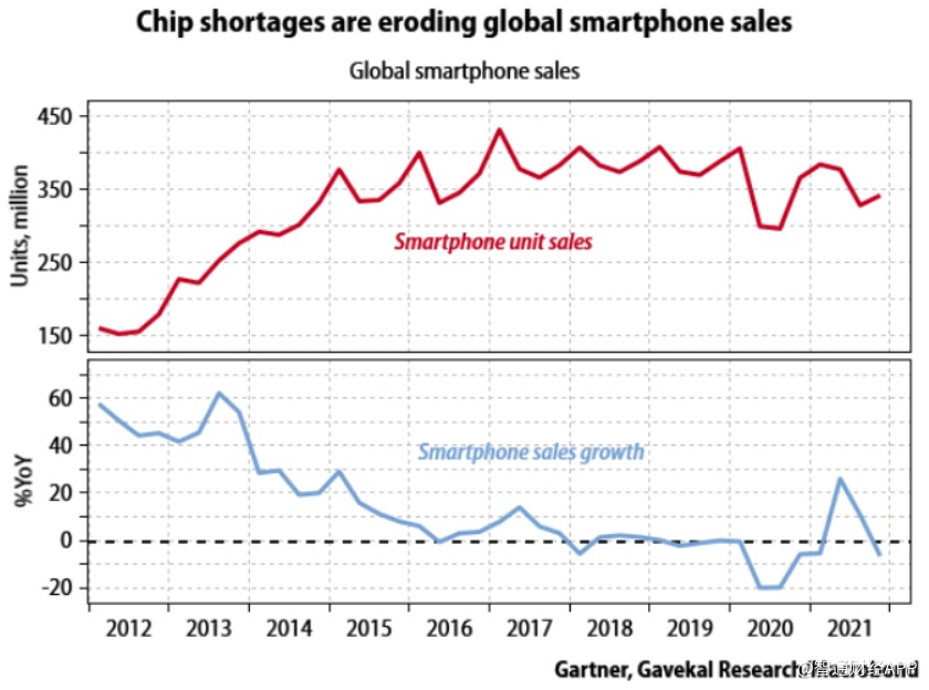 一开始,受半导体短缺影响最大的是汽车行业,但正如Gavekal Research的这张图表所示,半导体短缺的影响似乎已经转移到了智能手机领域。 智能手机销量略低于一年前的水平: