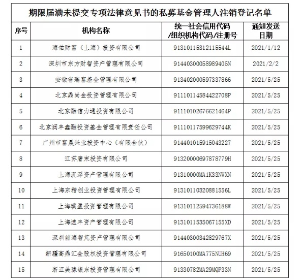 【协会公告】关于注销海佑财富(上海)投资有限公司等15家期限届满未提交专项法律意见书的私募基金管理人登记的公告