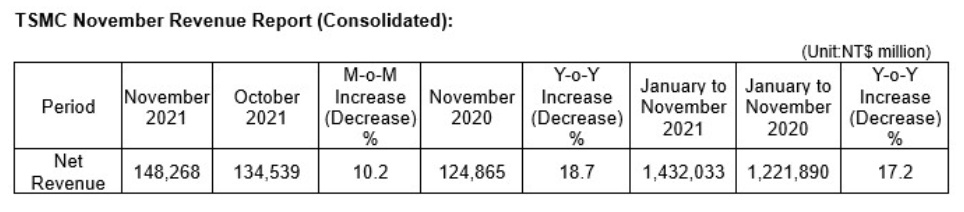 智通财经APP获悉,12月10日,台积电(TSM.US)公布2021年11月营收报告。数据显示,2021年11月合并营收为新台币1482.68亿元,环比增长10.2%,同比增长18.7%。此外,2021年1月至11月累计营收为新台币14320.33亿元,较上年同期增长17.2%。
