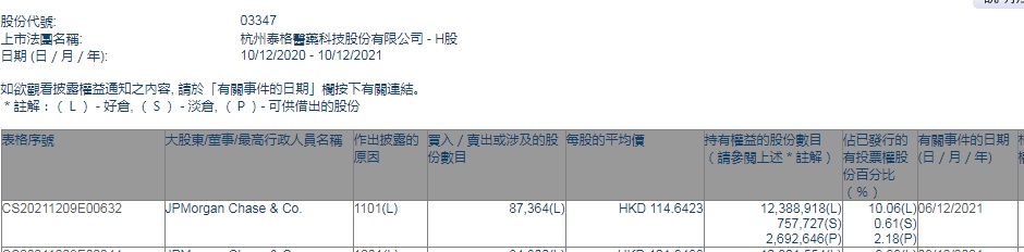 智通财经APP获悉,香港联交所最新资料显示,12月6日,小摩增持泰格医药(03347)8.7364万股,每股作价114.6423港元,总金额约为1001.6万港元。增持后最新持股数目约为1238.89万股,最新持股比例为10.06%。