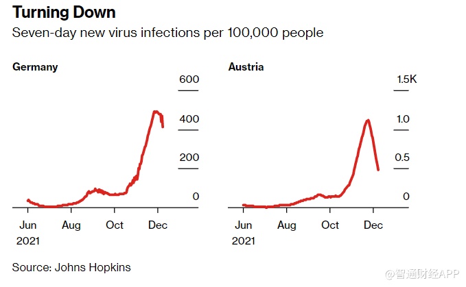 尽管各国的趋势各不相同,但欧盟的总确诊病例数似乎已进入平稳期。 奥地利和德国的7天内每10万人发病率开始下降,其中,奥地利的发病率较上月末下降了一半以上。