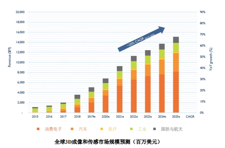 具体而言,随着科技的不断进步,2D成像逐步向3D视觉感知升级,3D视觉感知市场规模正处于快速增长的爆发前期:据法国市场研究与战略咨询公司Yole发布的报告显示,2019年全球3D视觉感知市场规模为50亿美元,且市场规模将快速发展,预计在2025年达到150亿美元,2019-2025年复合增长率约为20%。