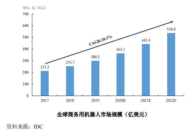 而再看AIoT领域中的服务机器人市场,由于3D视觉传感器可以帮助服务机器人高效完成人脸识别、距离感知、避障、导航等功能,使其更加智能化,目前已实现落地的应用包括扫地机器人、自动配送机器人、引导陪伴机器人等,服务于家庭、餐厅、医院等多个线下场景。据IDC数据,2017年全球商务用机器人市场规模为213.2亿美元,预计2022年全球市场规模可达538.0亿美元,2017-2022年复合增长率预计为20.3%。