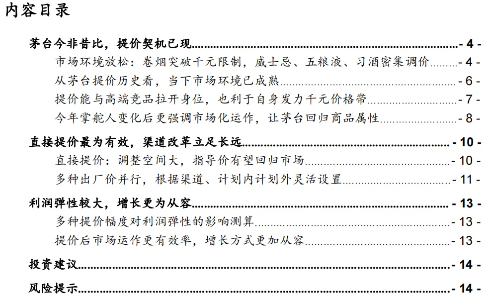 投资建议:当下茅台的市场环境、竞争格局和管理层的市场化改革决心都已不同往昔,对主力大单品飞天茅台的提价时机已经成熟。通过对茅台提价历史的梳理回顾,可清晰看到茅台历次提价均幅度较大,指导价通常贴近实际市场价格,因此考虑目前的批价水平和渠道利润,提价幅度或超预期。提价一方面将明显增厚利润,另一方面也有利于茅台渠道改革和市场化运作,并为茅台1935新品理顺价格带。贵州茅台作为龙头对白酒行业有明显带动作用,如果顺利提价将有望为其他高端和次高端白酒品牌打开价格空间,渠道信心增强,行业将进入增库存的景气周期,明年或有难得的行业性投资机会。我们看好五粮液、泸州老窖理顺价格体系实现稳健增长,汾酒、洋河、古井贡、酒鬼酒等次高端和区域酒也有望延续增长弹性。