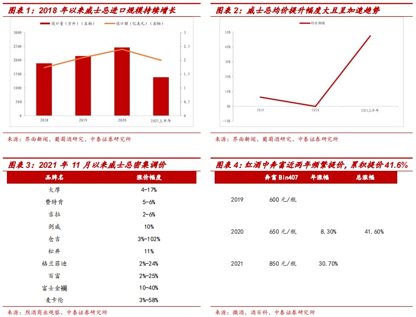 近三年来威士忌均价大幅提升。红酒核心品牌频繁提价,且累积涨幅较大。2018-2020年威士忌进口额的复合增速高出进口量的增速3pct,2021年上半年均价相对于2020年均价提升47%。红酒中澳大利亚品牌奔富在中国的认可度很高,自2019年以来累积提价超40%。