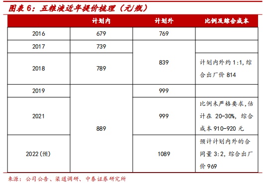 参考浓香龙头五粮液,提价频率高且累积幅度较大。五粮液基本保持每1-2年一次的提价节奏,计划内出厂价相比于2016年提升31%,计划外提升40%,同时也通过计划内外比例实现综合成本提升。