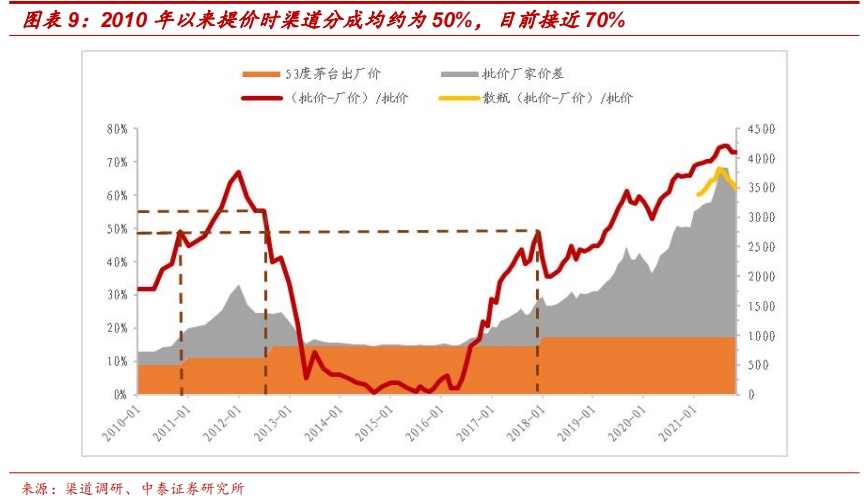 茅台今非昔比,提价契机已现:(1)在总量有限的情况下,食品饮料公司普遍采取纵度打法。今年11月来威士忌密集调整价格,其中高端酒和老酒上涨幅度较大。从黄鹤楼卷烟破千、五粮液(000858.SZ)习酒调价上也可看到近期中国高端烟酒的涨价限制或已松动。(2)从茅台提价历史看,当下市场环境已成熟:茅台自2010年以来每次提价时渠道分成均为50%左右。近两年飞天批价与出厂价的剪刀差持续变大,渠道分成已接近70%。(3)提价能与高端竞品拉开身位,也利于自身发力千元价格带。从外部环境看,酱香竞品多紧贴茅台零售价定价,如不提价可能损伤品牌力。从自身产品结构看,茅台缺乏千元价格带核心大单品。今年茅台1935投放节奏慢于预期,或需飞天调价以理顺价格带。(4)新董事长锐意进取,市场化改革决心强。9月以来茅台市场化改革措施频出,效果显著。未来行政干预手段有望逐步转为市场化法制化制度,其中最有效方法就是缩小零售价与真实批价的较大价差。