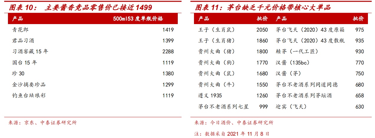 高端酒价格线就是生命线。从外部环境看,竞品紧贴茅台零售价定价,如不提价可能损伤品牌力。一线酱香酒厂的头部产品如青花郎、君品习酒、均定位千元价格带,指导价紧贴茅台的零售指导价1499元定价。虽然飞天批价远高于其他竞品,但是对普通消费者来说批价并不透明,酒厂要求的零售价和自营店、商超渠道的官方价格都被严格要求限制在1499元,因此消费者容易对品牌认知混乱,认为和飞天定价类似的酒品质也会与飞天接近,这也是近几年头部酱香品牌增长迅猛的重要原因。如果茅台飞天指导价仍维持1499不变,将来核心酱香竞品指导价甚至有超过飞天的可能,对茅台品牌力不利。
