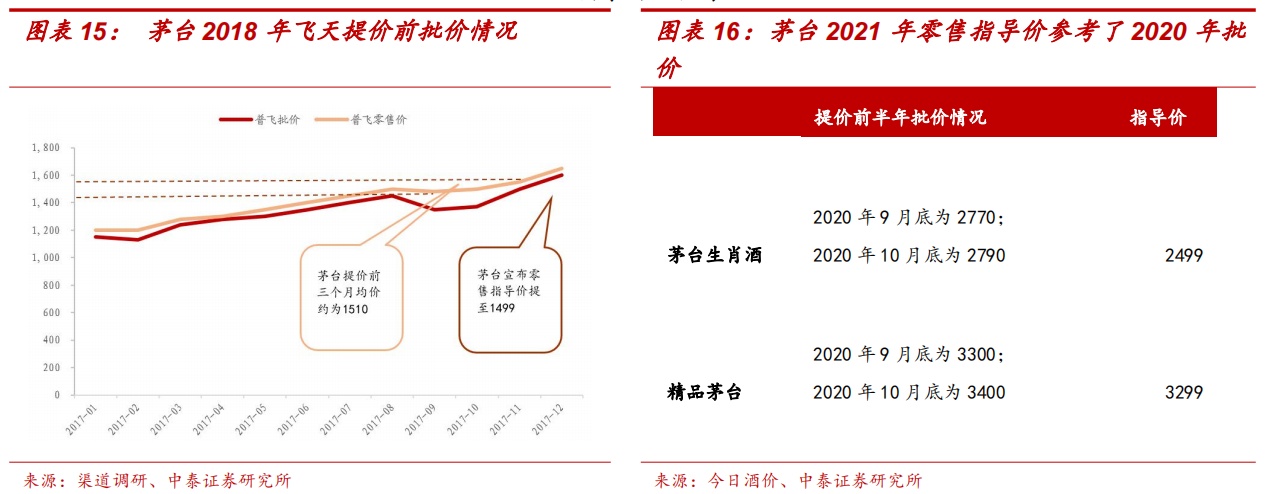 (1)从茅台提价历史看历次指导价都贴近实际一批价;回顾茅台指导价历史,茅台指导价在定价之初通常具有指导作用。2017年底茅台宣布的1499指导价接近2017年9~11月的批价均值;2021年非标产品的指导价也接近2020年9~11月的批价范围。