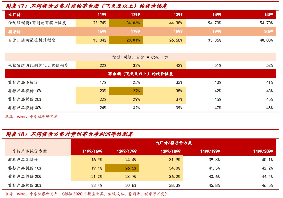 如果飞天出厂价提升,对应的利润弹性整体较为可观。参考2020年年报水平,假设销量、成本、费用率均不变,仅考虑此次提价,测算提价后的净利润相比于2020年净利润的增厚幅度。根据茅台提价历史情况,我们认为如果提价,1)指导价将和出厂价同步提升,有助于增厚自营和团购渠道的利润;2)非标产品渠道利润仍足,也有进一步提价的空间。