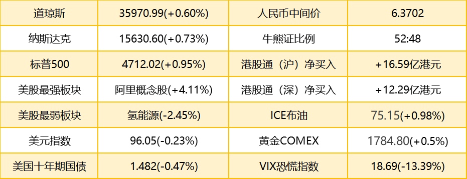 1. 上周末美股道指涨216.30点,涨幅0.6%,报35970.99点;纳指涨113.23点,涨幅0.73%,报15630.6点;标普500指数涨44.57点,涨幅为0.95%,报4712.02点,创收盘纪录高位。上周道指上涨4%,创3月以来的最大单周涨幅。纳指上涨3.6%,标普500指数上涨3.8%,二者均创2月以来的最大单周涨幅。港股ADR指数上涨,按比例计算,收报24045点,升50.23点或0.21%。