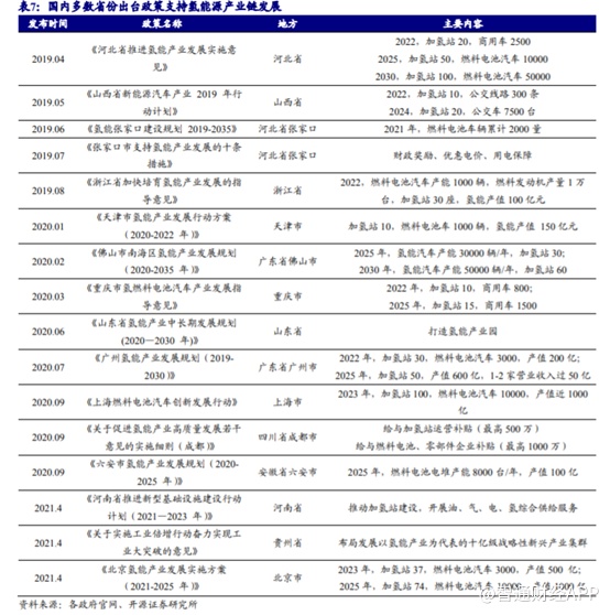 此外,各地政府也积极出台氢能产业发展规划,主要聚焦在氢燃料汽车(主要为城市公交大巴车和物流车)的推广、燃料电池核心技术研发、加氢基础设施建设以及氢能示范城区的打造。