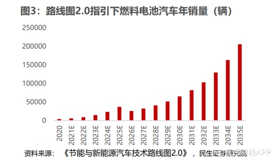 而2020年燃料电池汽车保有量为1万辆,销量为1177辆;民生证券预计2020-2025年年销量增速均值为56%,2025年年销量预计能达到3.7万辆,年销量增速均值为20%,2035年年销量预计达到20.6万辆。
