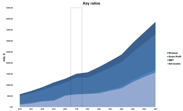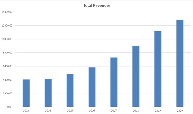 Adobe在21世纪的收入增长过快。营收放缓发生在2012-2014年向订阅模式的转变期间。然而,这个看似有风险的决定却是未来增长的关键驱动力,也是给有眼光的投资者的一份礼物。过去五年,ADBE的收入平均增长了21.94%。Adobe在收入超过150亿美元后仍在继续增长。