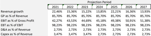 根据历史数据,进行预测利润率和其他相关指标。假设该公司将继续以过去五年的平均水平回购股票。终端增长率为5%。假设如下: