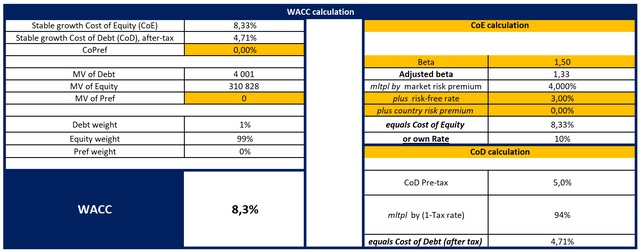 在股权稳定增长成本为10%的情况下,加权平均资本成本(WACC)为9.2%。
