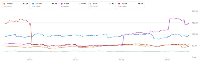 对投资者来说,关键问题是Adobe还能保持多久的强劲增长率(目前的市盈率已经反映在价格上了)。迄今为止,营收没有显示出放缓的迹象,管理层在过去三个季度中两次提高了业绩指引。