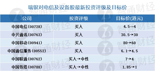 智通财经APP获悉,瑞银发布研究报告称,运营商中首选中国电信(00728),目标价降至4港元;中兴通讯(00763)则为首选设备股,目标价降至30港元,均予“买入”评级。