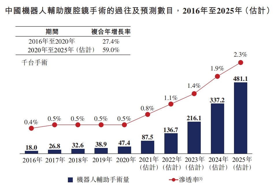 根据弗若斯特沙利文的数据,我国机器人辅助腹腔镜手术数目从2016年的18000台快速增长至2020年的47400台,复合年增长率达到27.4%,预计2025年将继续增长至481100台,2020至2025年的复合年增长率将达到59%。