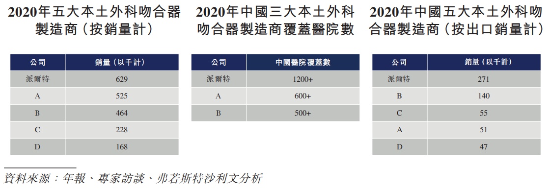 按2020年的销量计算,派尔特位于国内外科吻合器制造商的第一名,占据了国内外科吻合器制造商销量的14.3%,若按2016年至2020年的出口销量计算,派尔特是国内最大的本土外科吻合器参与者。除此之外,派尔特在2020年医院覆盖数量方面,也是位于本土外科吻合器制造商的全国第一。