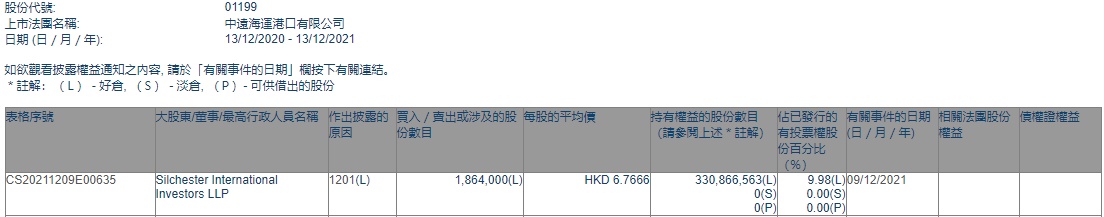 智通财经APP获悉,香港联交所最新资料显示,12月9日,Silchester International Investors LLP减持中远海运港口(01199)186.4万股,每股作价6.7666港元,总金额约为1261.29万港元。减持后最新持股数目约为3.31亿股,最新持股比例为9.98%。