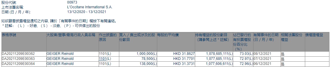 智通财经APP获悉,香港联交所最新资料显示,12月6-8日,主席兼执行董事GEIGER Reinold分别增持欧舒丹(00973)13.8万股、7.85万股、100万股,每股作价分别为31.3731港元、31.7701港元、31.8627港元,总金额约为3868.61万港元。增持后最新持股数目约为10.79亿股,最新持股比例为73.03%。