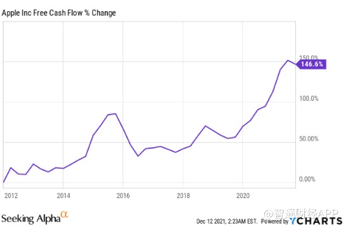 作为一只蓝筹股,苹果近年来一直在积极增加其自由现金流(FCF),自2011年底以来,该公司的FCF已经上涨了146.6%。