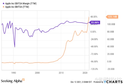 也就是说,FCF过去10年复合年增长率为9.45%,但这是由于去年的经济放缓。在过去20年里,苹果EBITDA利润率表现出非常好的增长势头,在EBITDA本身增长的背景下,这意味着苹果未来几年FCF进一步增长的可能性相当高。