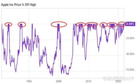 与此同时,苹果的股价在高峰已经持续了太长时间。从历史上看,股价接近高点的时间越长,其修正幅度就越大。