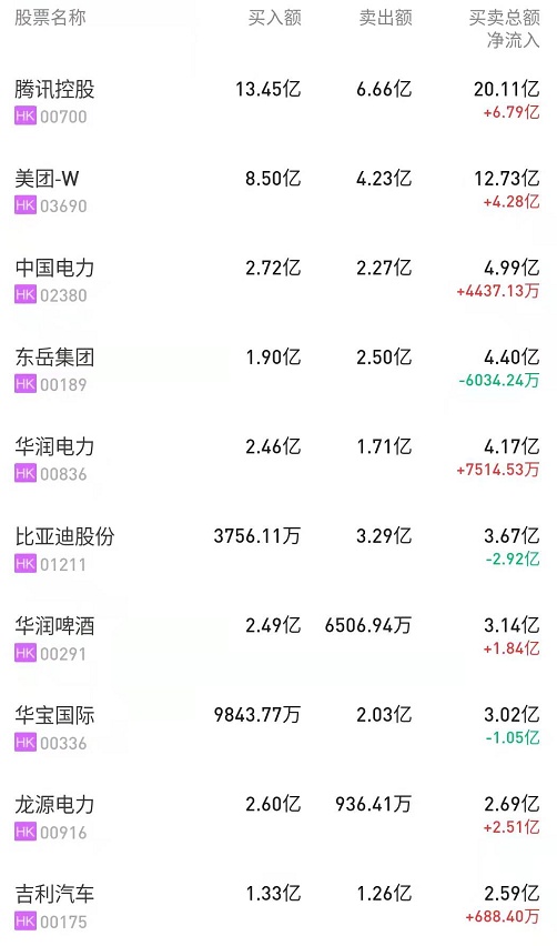 北水净买入最多的个股是腾讯(00700)、美团-W(03690)、龙源电力(00916)。北水净卖出最多的个股是华宝国际(00336)、东岳集团(00189)、工商银行(01398)。