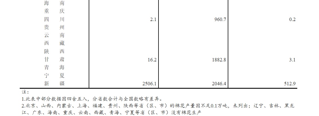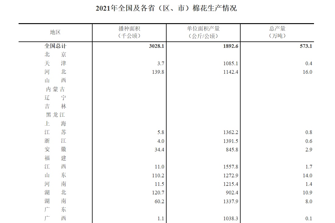 国家统计局公布的全国棉花产量数据显示,2021年全国棉花产量573.1万吨,比2020年减少18.0万吨,下降3.0%。其中,新疆棉花产量512.9万吨,比上年减少3.2万吨,下降0.6%;其他地区棉花产量60.2万吨,比上年减少14.7万吨,下降19.6%。