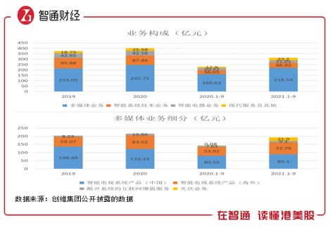 多媒体业务包括智能电视、互联网增值及光伏业务,其中最老的业务是智能电视,近几年在产品及市场进行战略调整,产品重点发展MiniLED产品,抢占高端液晶的市场,而市场则是加大海外拓张。2020年,海外市场增长对冲了国内的下滑,今年首三季度,由于疫情海内外智能电视销量分别下滑19.9%和15.7%,但因重心转移至OLED高端电视产品,平均售价大幅上涨,使得海内外收入分别增长10.8%和35%。