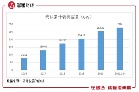 而光伏行业持续受益于碳中和政策,在减碳要求下能源替代加速,大部分地区制定了能源替代规划,清洁能源迎来了野蛮成长周期。2020年光伏累计装机量253.43GW,五年复合增长率34.9%,2021首三季278GW,超过2020年全年的装机量。