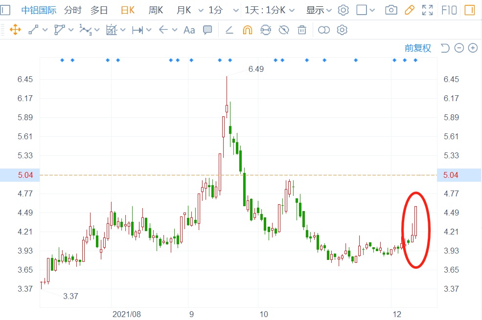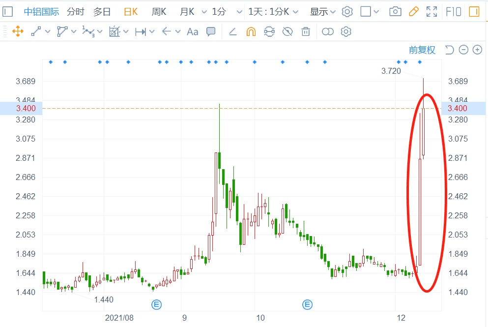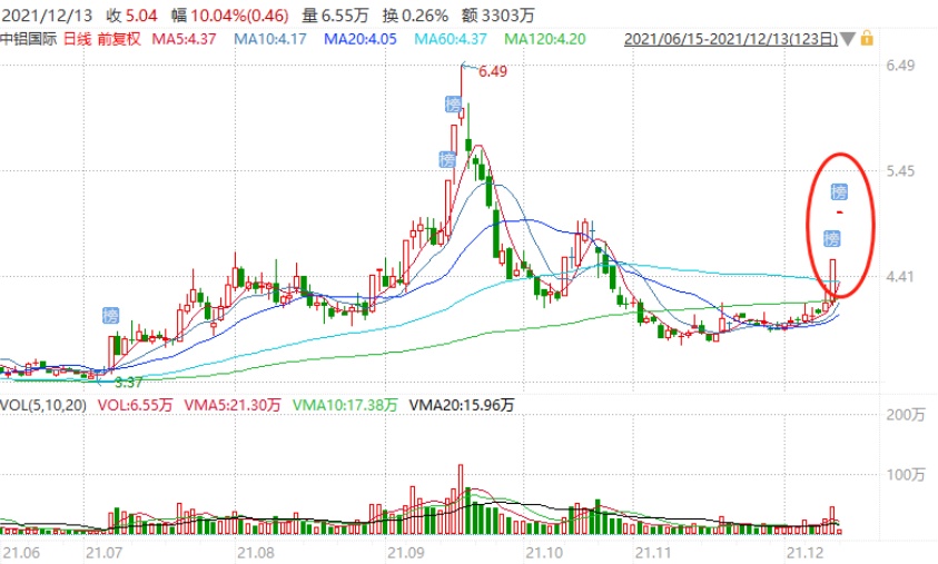 具体而言,12月9日到13日,短短3个交易日,中铝国际A股累涨近25%,分别录得两个涨停板,目前股价报于5.04元;中铝国际H股的股价则累涨逾107%,目前股价报于3.4港元。