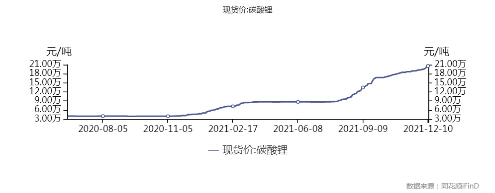 据同花顺iFinD数据披露,截止到12月10日,碳酸锂现货价已上涨到20.56万元/吨,自年初的5万元/吨,累计涨幅已经超过300%。