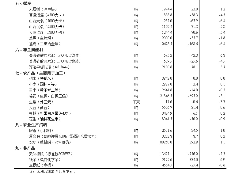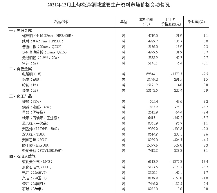 2021年12月上旬流通领域重要生产资料市场价格变动情况