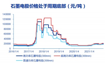 石墨电极下游为电炉钢和工业硅,国内市场70%需求分布用于电炉钢,25%用于工业硅,黄磷等占5%,电炉钢和工业硅都是碳中和鼓励方向。目前价格与盈利处于周期底部,目前普通功率石墨电极价格1.8万/吨,历史波动区间1.2万—10万/吨,行业盈利角度除有原材料配套的龙头企业外普遍亏损。