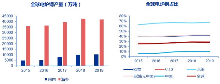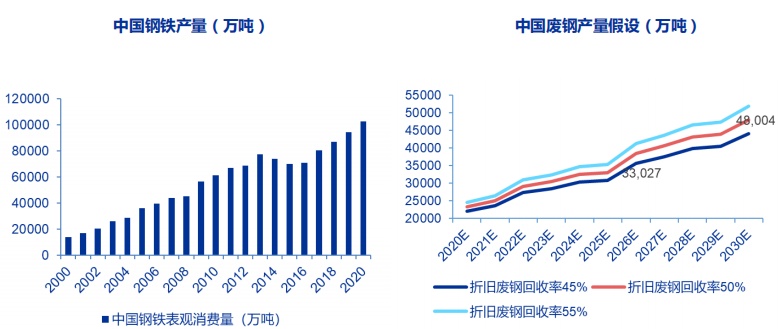 废钢报废量迎来高速增长,2020年国内废钢报废量约2.1亿吨,预计未来年报废量增速约10%+,钢铁国企自建回收站后废钢报废量有望快速增长。长流程转为短流程炼钢后更多废钢将采用电炉冶炼形势,未来电炉钢占比有望快速提升,年增速15%。
