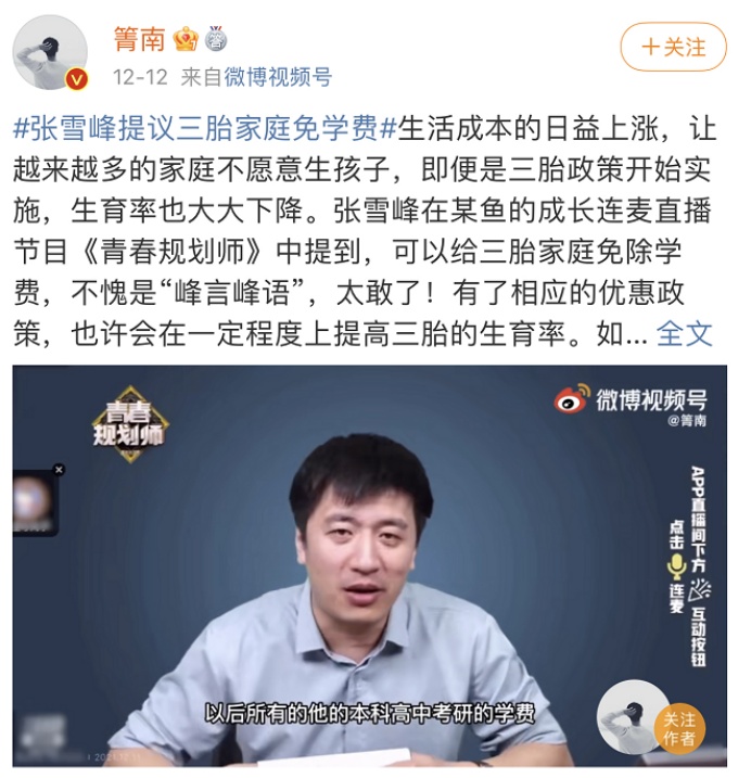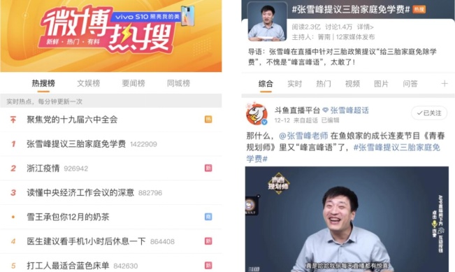 12月11日,在斗鱼《青春规划师》节目中,张雪峰在谈到考研问题时提出三胎家庭应免学费的建议,之后这一话题迅速在社交媒体引发热议,黄金时段持续占据微博热搜榜第一位置,不到24小时话题阅读量已突破2亿,并获得多家媒体转发关注。