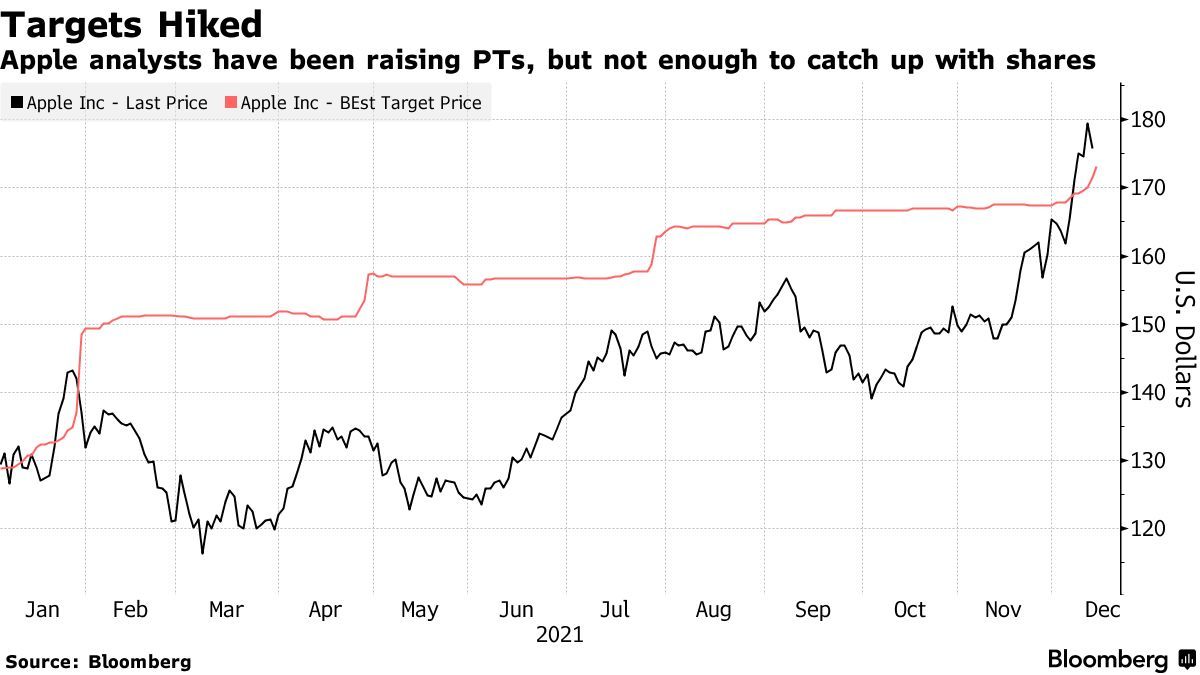 过去几周,分析师们一直在迅速提高苹果的目标价格。在周一,摩根大通将苹果目标价上调至210美元,表示看好iPhone SE 5G机型的潜在销量,并强调与iPhone 13周期相关的大部分收入和盈利增长“仍将继续”。CFRA Research周一也上调了目标,称对苹果的普遍预期可能显得过于保守。