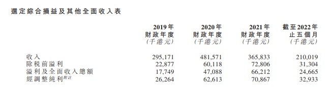 于2019年、2020年,2021年以及截至2022年止五个月国际永胜集团收入分别为约2.95亿、4.81亿、3.66亿、2.1亿港元。同期,溢利及全面收入总额分别为1774.9万、4708.8万、6621.2万、2466.5万港元。