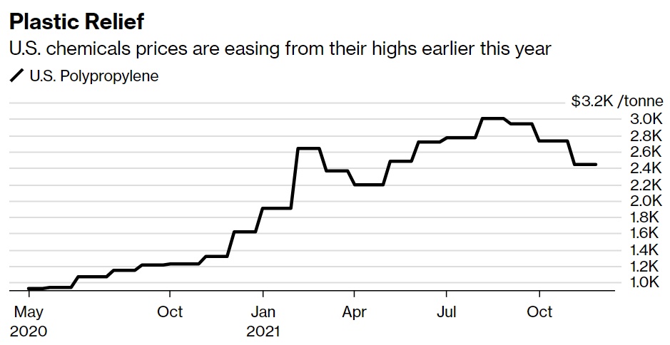 用于生产日常塑料的化学品的价格开始从历史高位回落,这对美国40年来速度最快的通货膨胀起到了缓解作用。