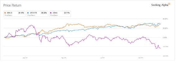 伯克希尔走势在过去一个月内优于标普500和Ark Innovation EFT
