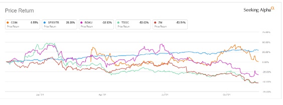 上图显示Coinbase(COIN.US)、Roku(ROKU.US)、Teladoc(TDOC.US)和Zoom Video Communications(ZM.US)的走势不如人意。