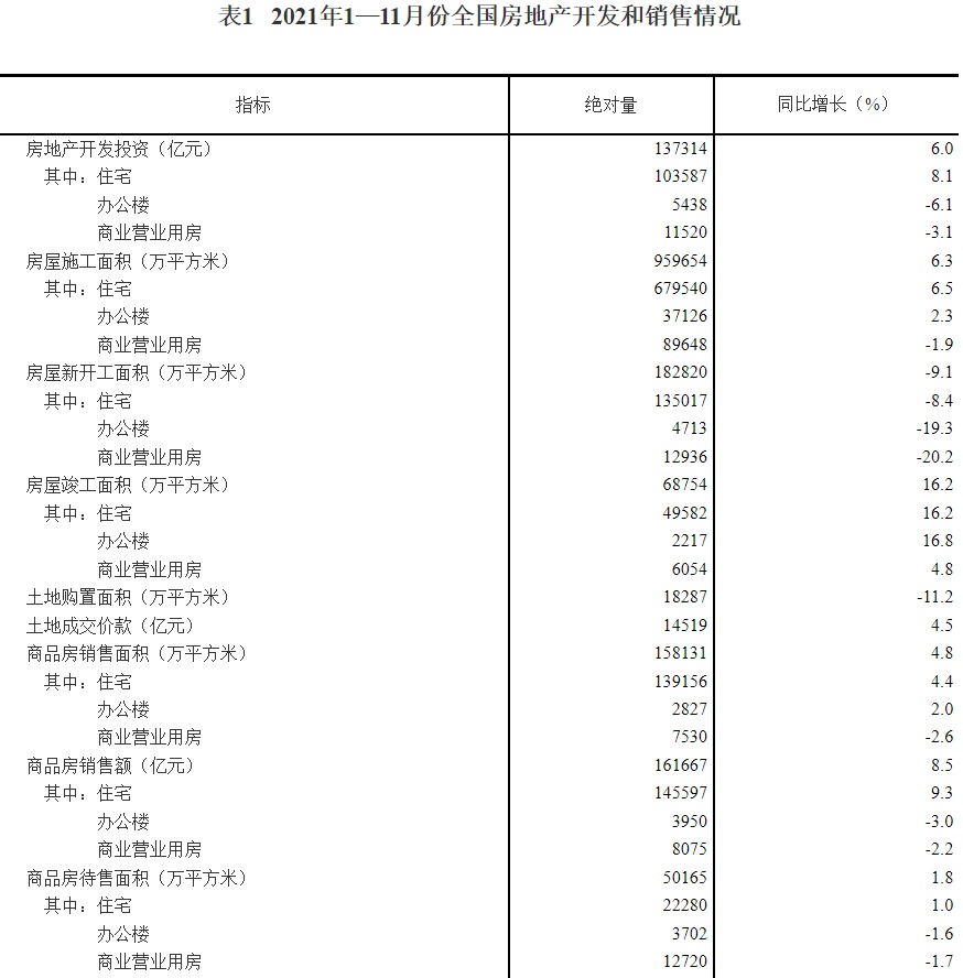 国家统计局:1—11月份全国房地产开发投资增长6.0%