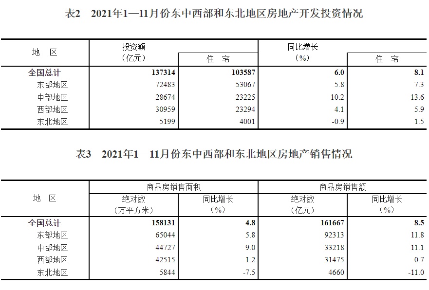 1—11月份,东部地区房地产开发投资72483亿元,同比增长5.8%;中部地区投资28674亿元,增长10.2%;西部地区投资30959亿元,增长4.1%;东北地区投资5199亿元,下降0.9%。